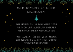 Wir haben am 18. Dezember 2025 ab 1400 Uhr aufgrund unserer Weihnachtsfeier geschlossen und danken für Ihr Verständnis. Wir wünschen allen eine schöne Vorweihnachtszeit! ✨ (420 x 296 mm)